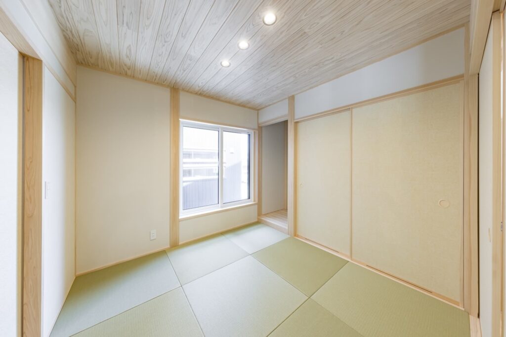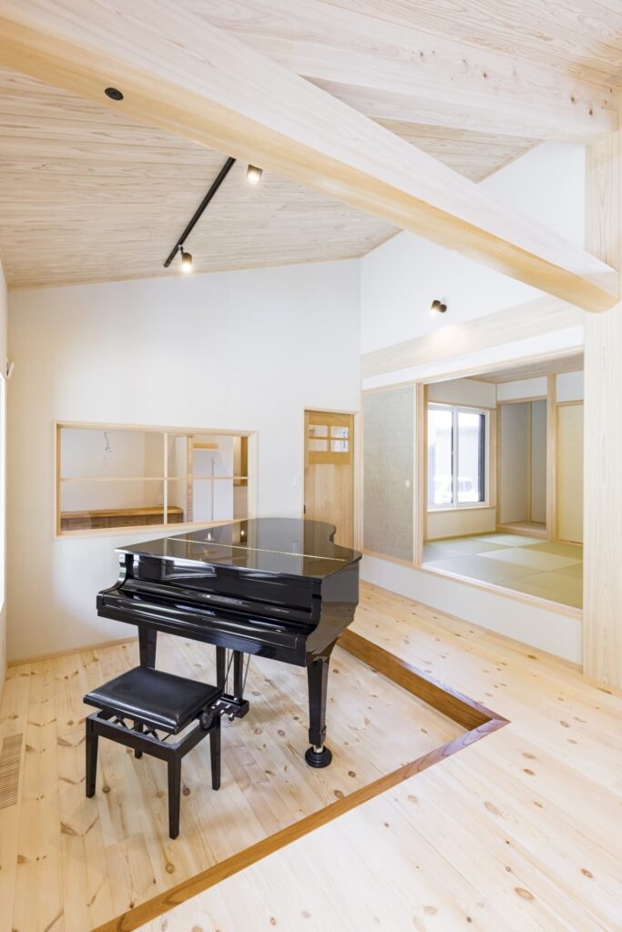 LDKは小上がり和室付きのグランドピアノが置ける28帖の大空間。グランドピアノは地震を考慮し床を1段下げて。結果対面する小上がり和室との段差が動きのある楽しい空間となりました。