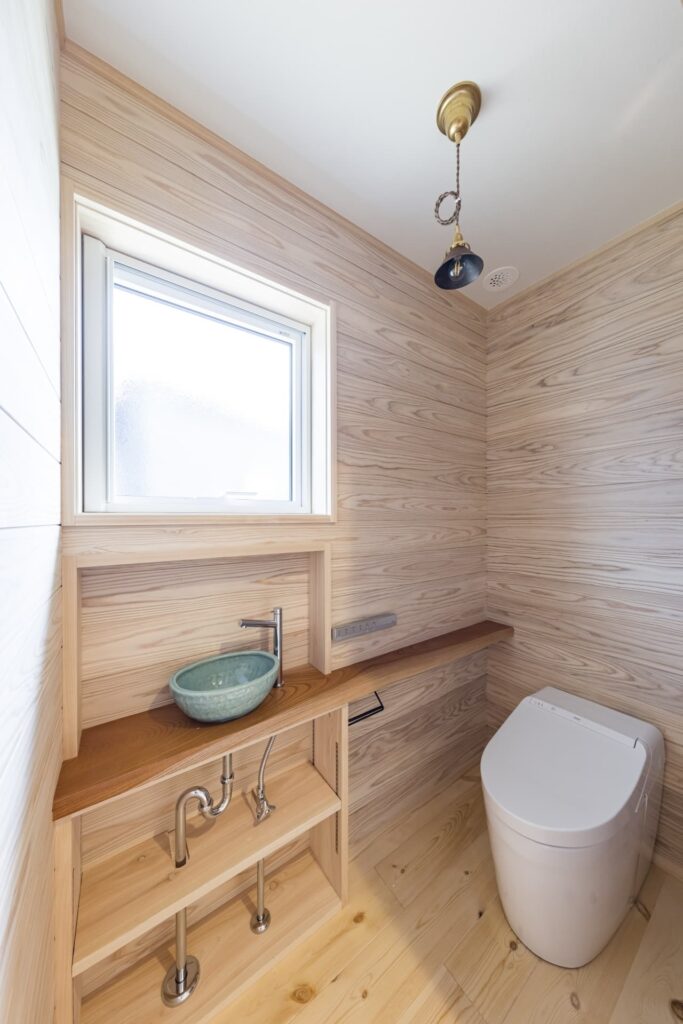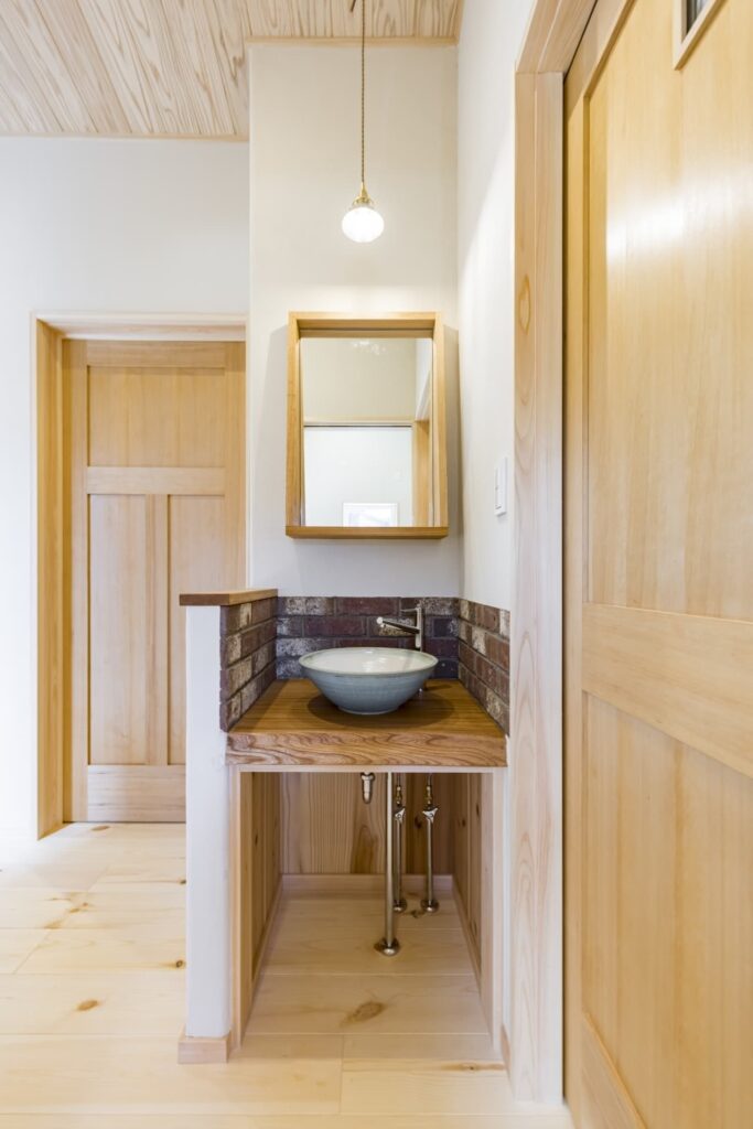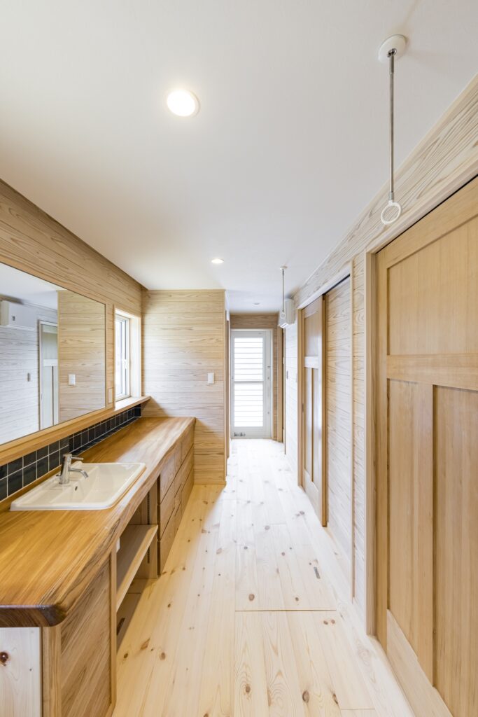 ランドリースペースを兼ねた洗面所。奥にはプライベート用トイレ、勝手口を設けて庭にもストレートに出入りできる。