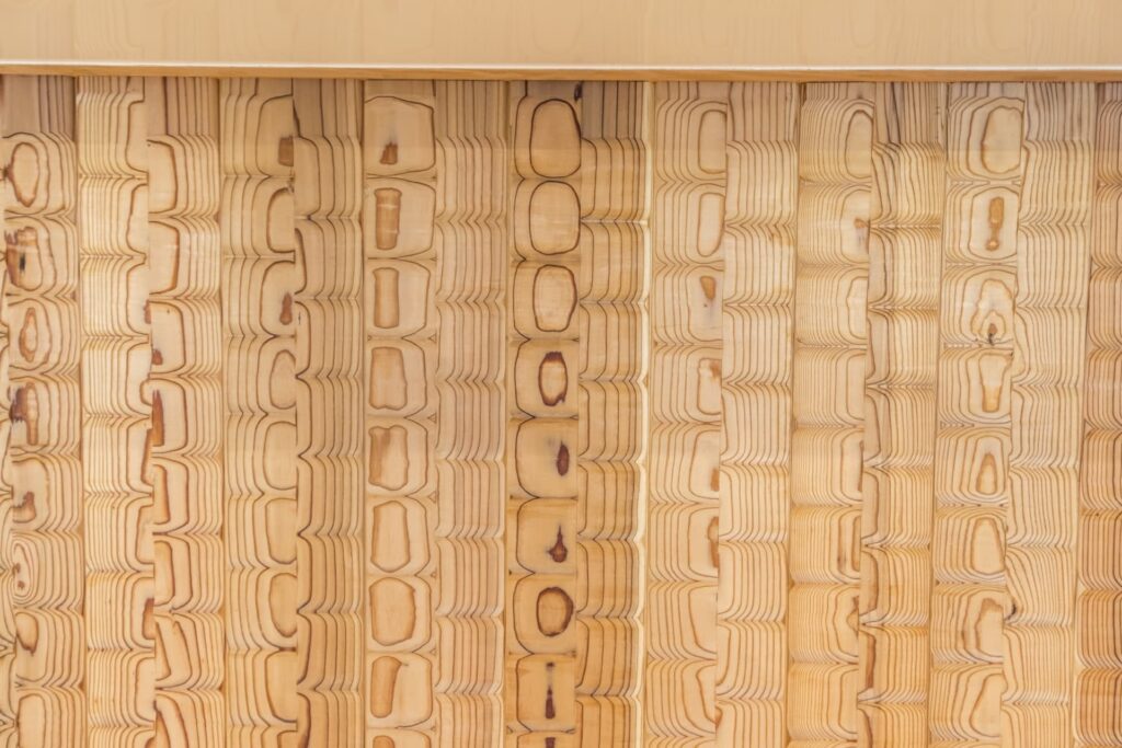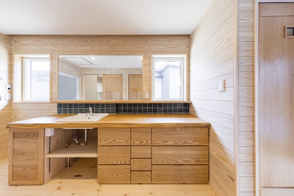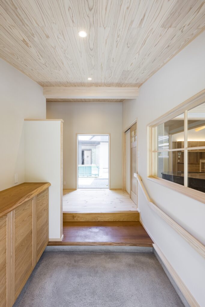 玄関正面は中庭に。下駄箱カウンター・式台・上がり框はケヤキで揃えた。こちらの木材もせこ住研の熟成倉庫から。