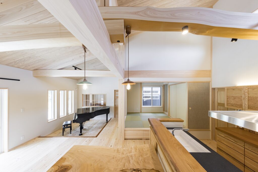 ダイニングから見たピアノスペースと小上がり和室。高低差のある床と重ねた梁がリズミカルな空間に。テーブルはトチノキ。