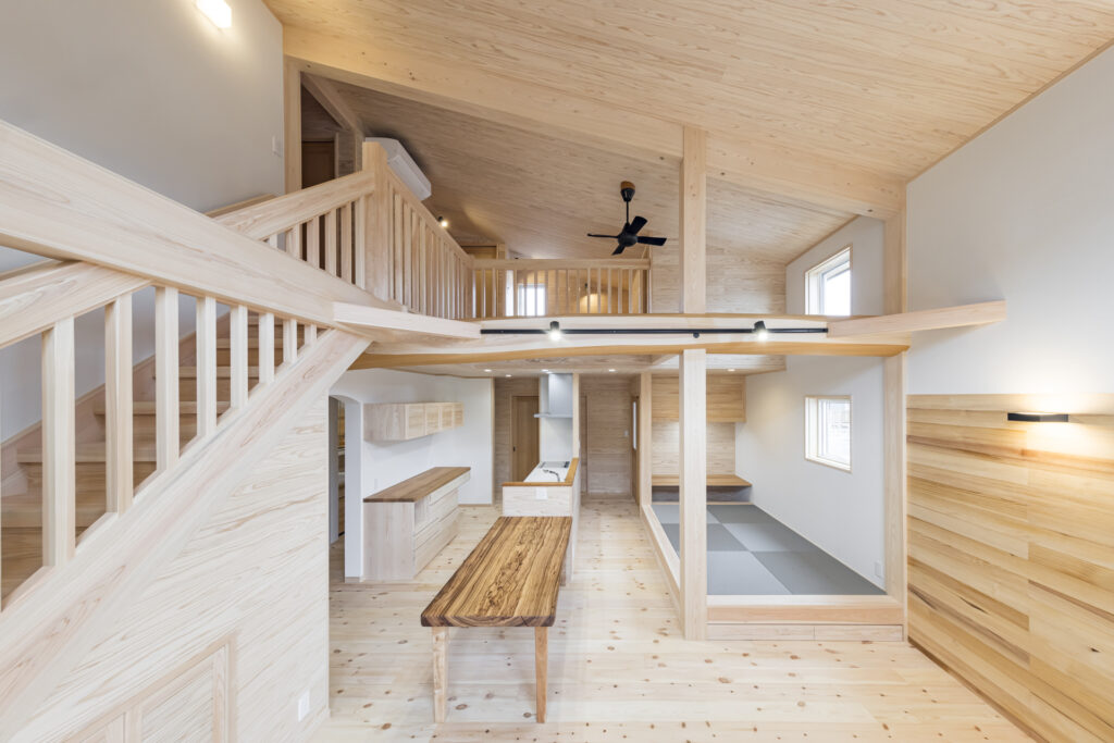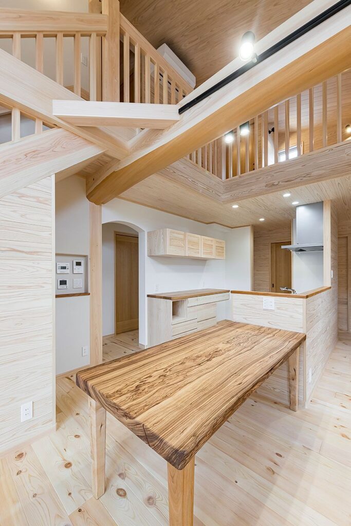 LDKを横断する5.3mのタイコ梁はダイナミックな見た目はもちろん、大きな断面積で構造の強化にも一躍買っている。