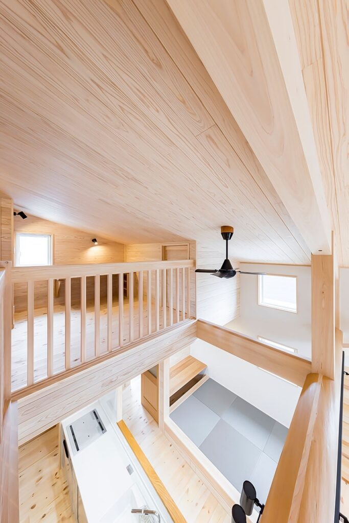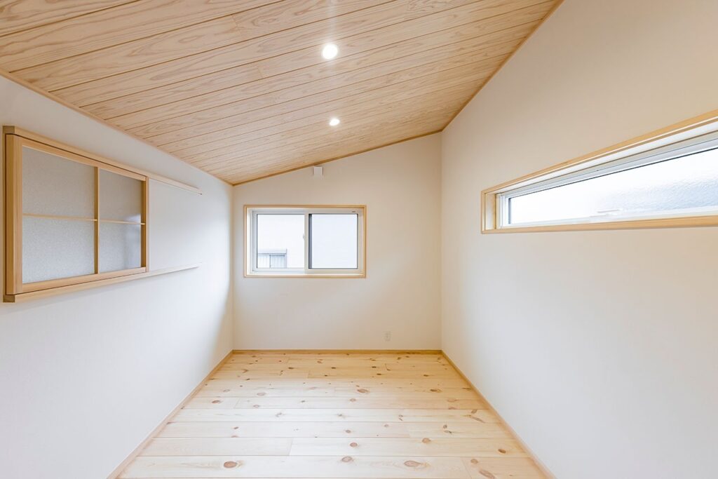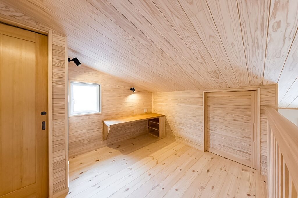 二階設けられたパソコンカウンター。横には屋根裏空間を活かした納戸を作った。