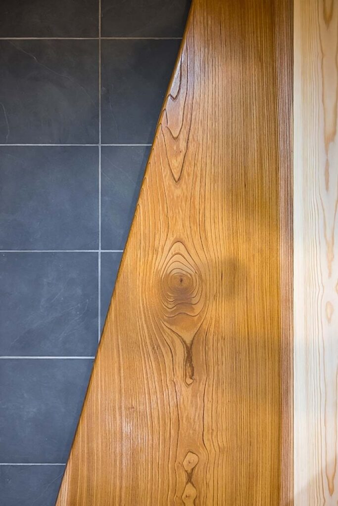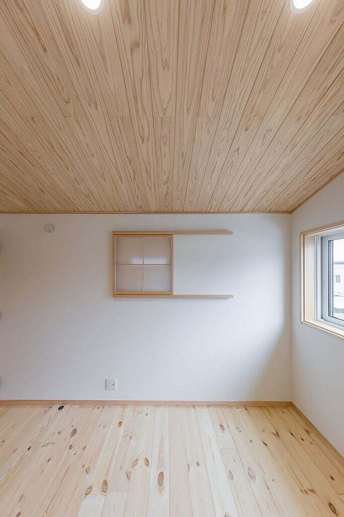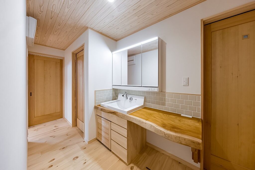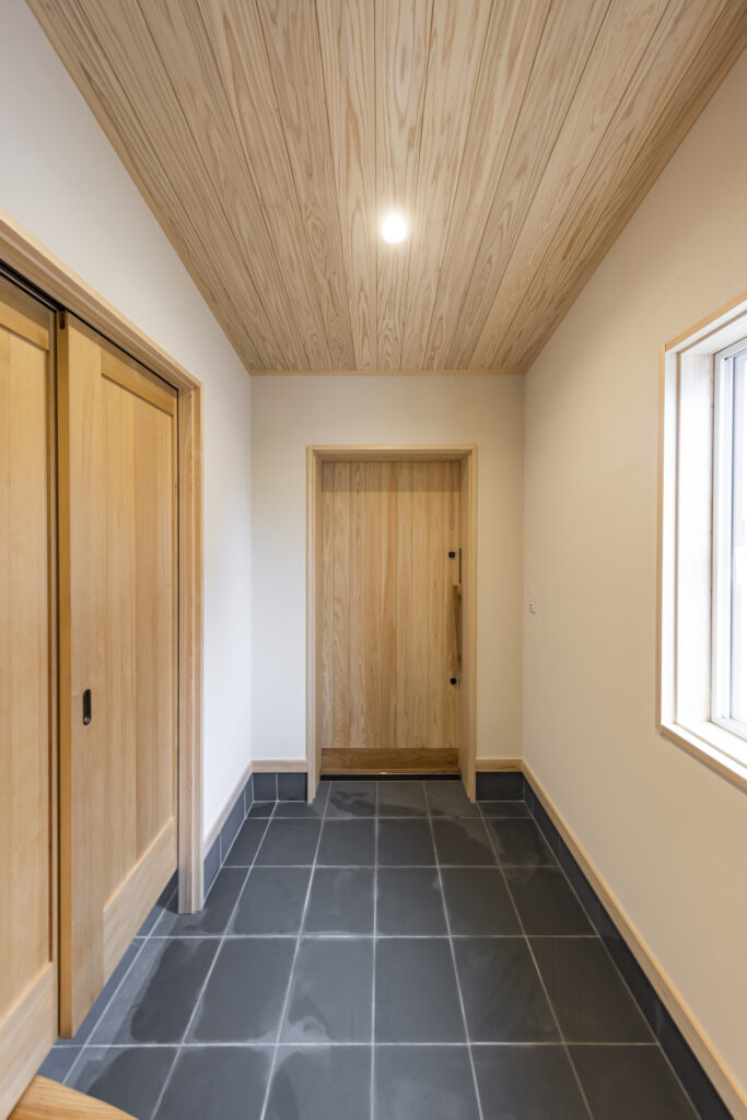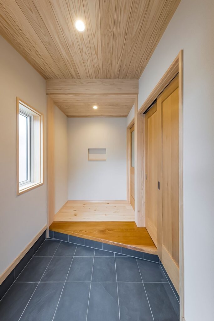 玄関の土間収納は土間からアクセスする計画だったが、建築途中に施主様より靴を履かず(フロアレベルでも)土間収納に出入りしたいと要望があった。どのようにするか頭を悩ませたが、建具を一本引きから二本引きにすることで床と土間両方からアクセスできるようにした。ただ床をつなげるだけでは面白くないので3.5mほどあるケヤキの一枚板をつかうことで玄関が特別な空間となった。