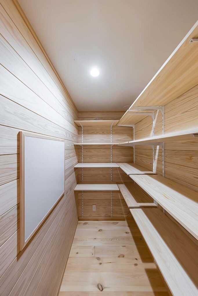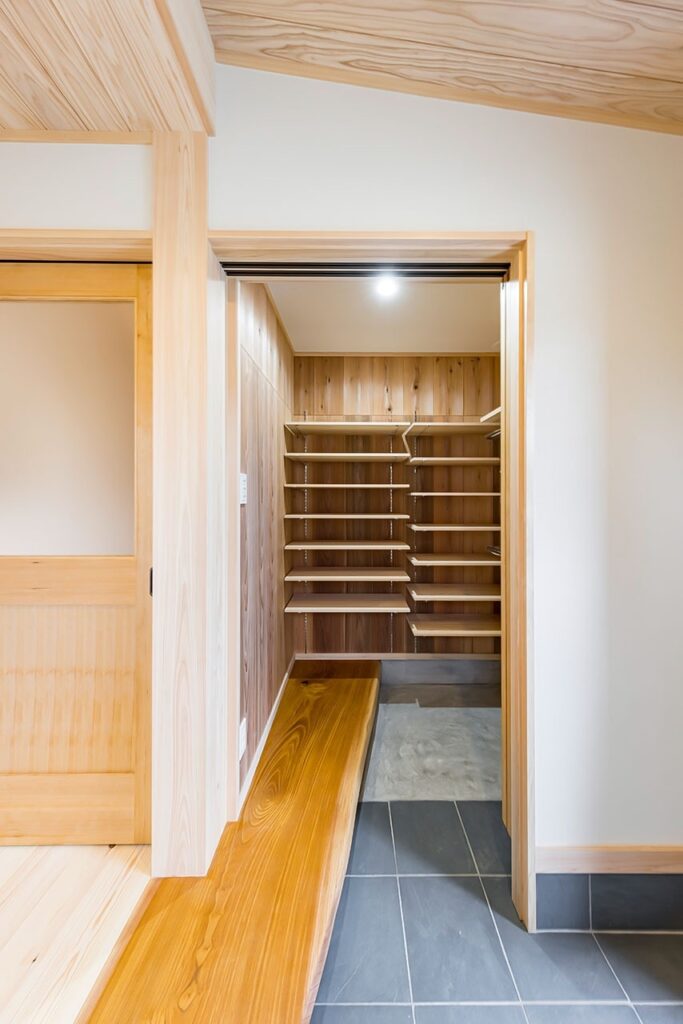 土間からもフローリングからも直接アクセスできる土間収納。建具の大きさを工夫して出来た空間に、ケヤキの一枚板で特別な個性を持たせた。