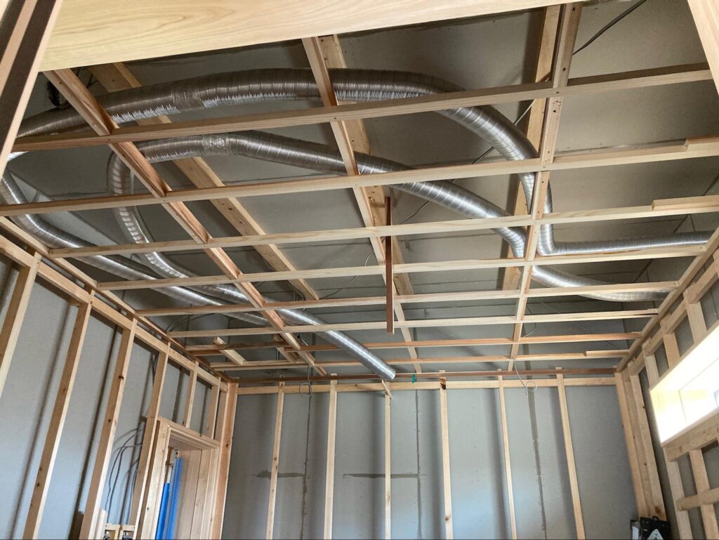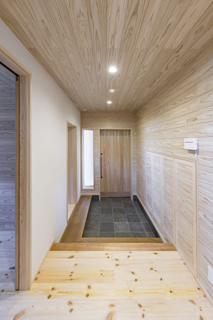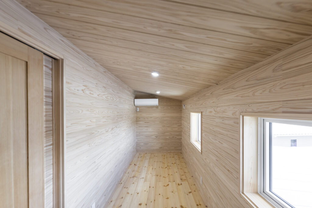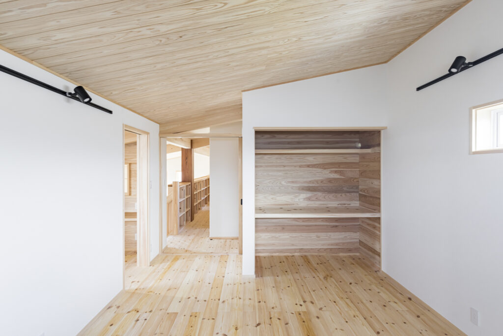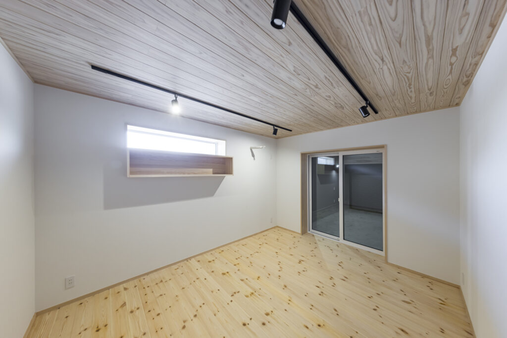 また、防音室も本邸のハイライトである。趣味でピアノを嗜む施主様は防音室を製作した。二重土間、入れ子構造の室内空間によって構造的に他の部屋と縁を切ることによって高い防音性を確保できるようにした。(自邸内には少し音が漏れてもいいとのことなので木製防音ドアにしてあるが、金属製のドア等に換装することによってより高い防音性を発揮するように計画してある)