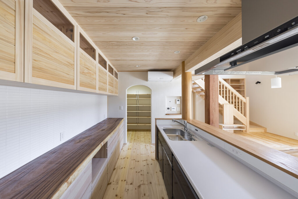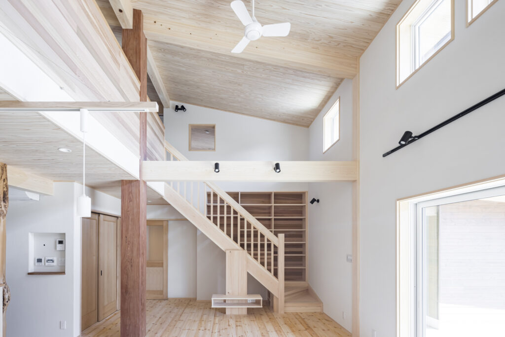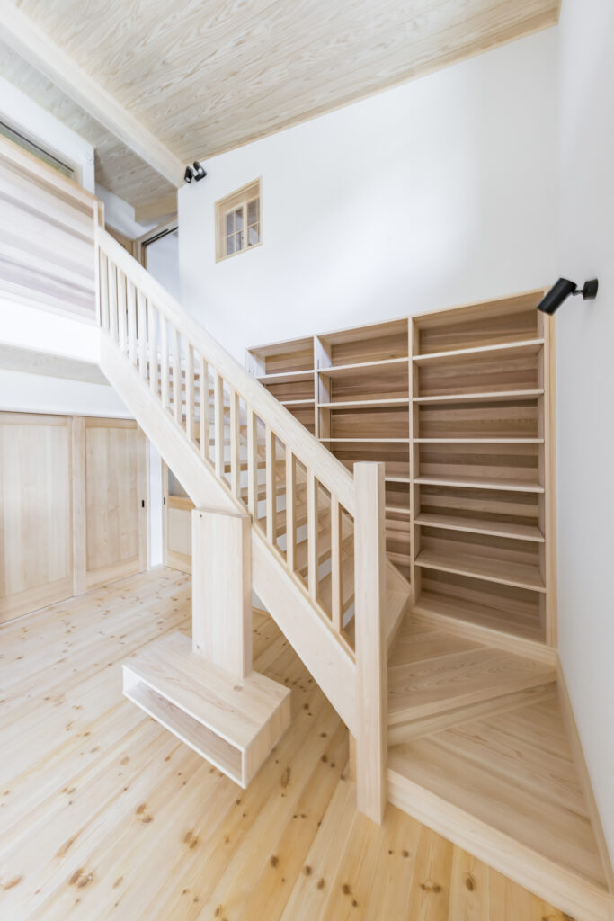 施主様は家族揃って読書家ということもあり、書籍の収容量はもとよりどのように日々本と付き合っていくか設計上強く意識した。仲のいい施主様家族が階段に腰掛け本を読み、キッチンの家族と会話し、リビング、階段を見渡せる小部屋から誰かが顔をだすようなそんな家にしたいと思った。