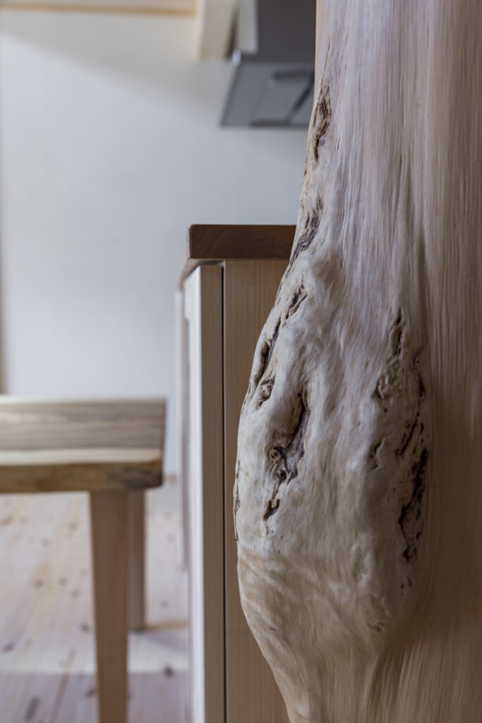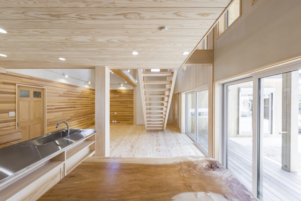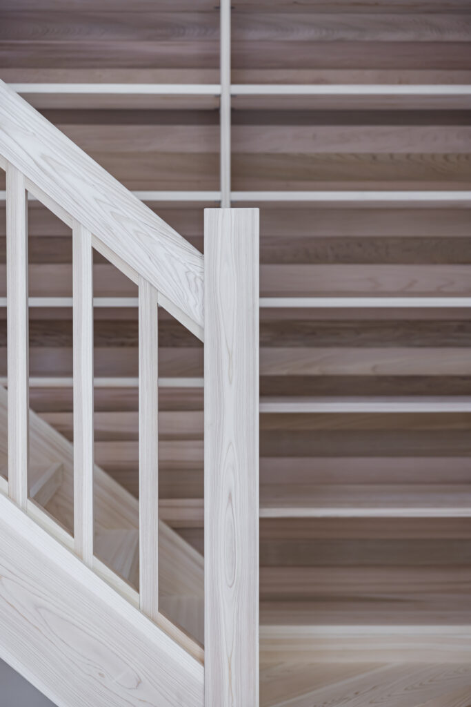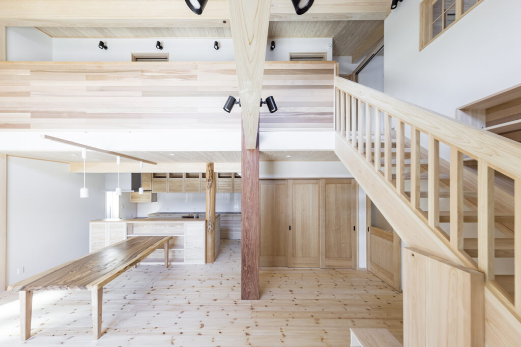 ザ・リビング階段。桧で出来たオブジェのようだがLDKのパーテーションも兼ねている。