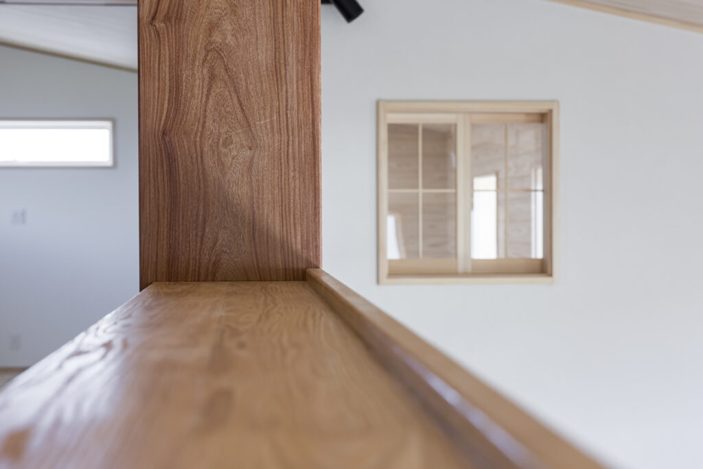 蔵書が増える一方なのが読書家の悩み。二階手すりも本棚にすることで来る日(笑)に対応した。子ども部屋前のスペースに配置することで、子どもたちの読書欲も満たしてくれる。
