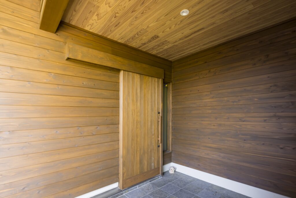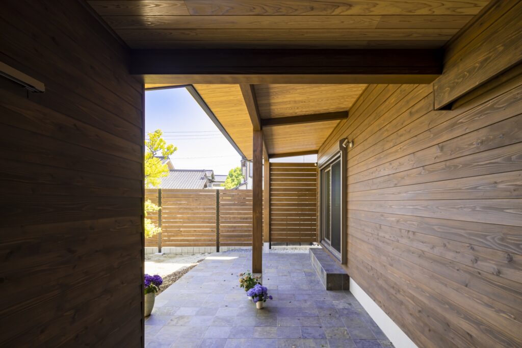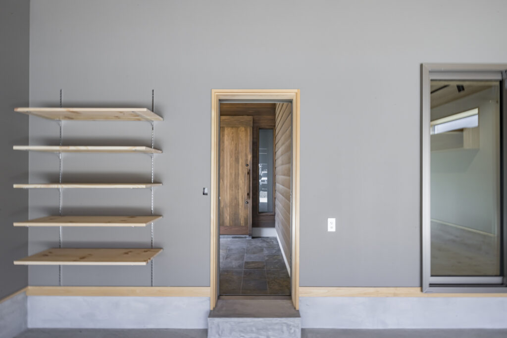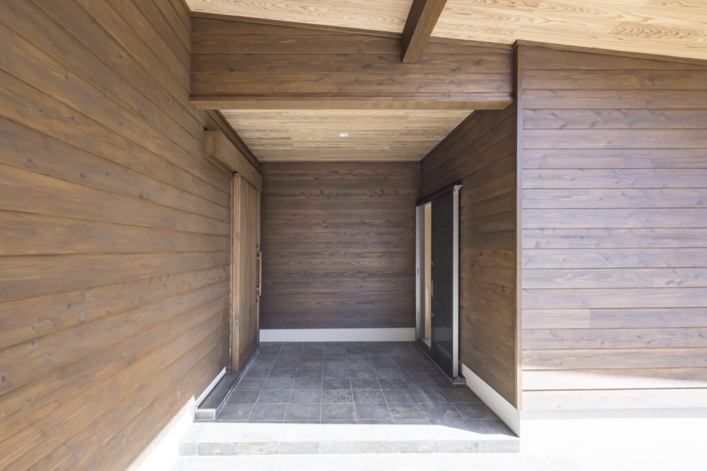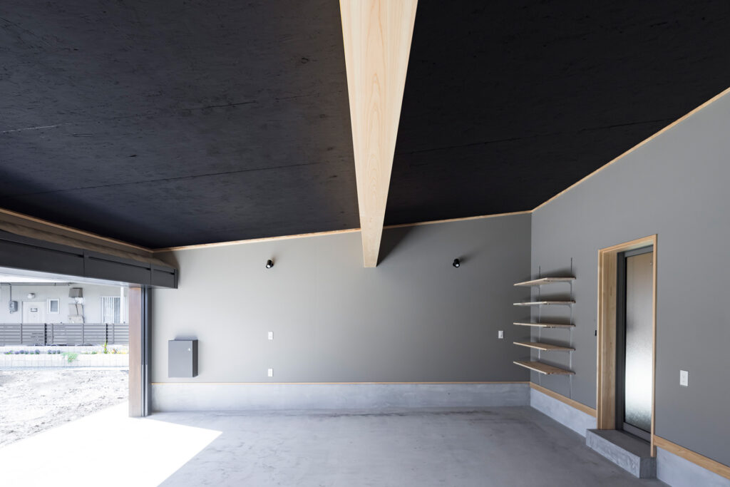 ガレージからポーチを介して雨に濡れずに玄関へ。ガレージ右手に見える掃き出しは楽器の搬入搬出を考慮している。