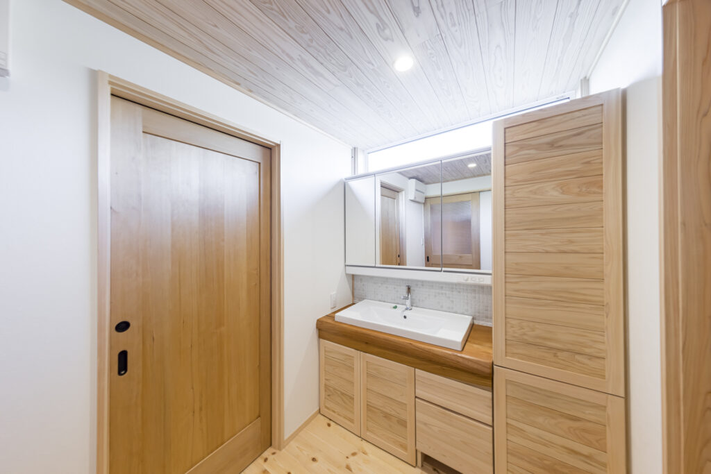 住宅密集地ということもあり計画当初より二階リビング案も施主様より相談を受けたが、奥行きのある広い土地だったので、一階リビングでも十分に落ち着きのある生活が出来ると判断、計画がスタートした。