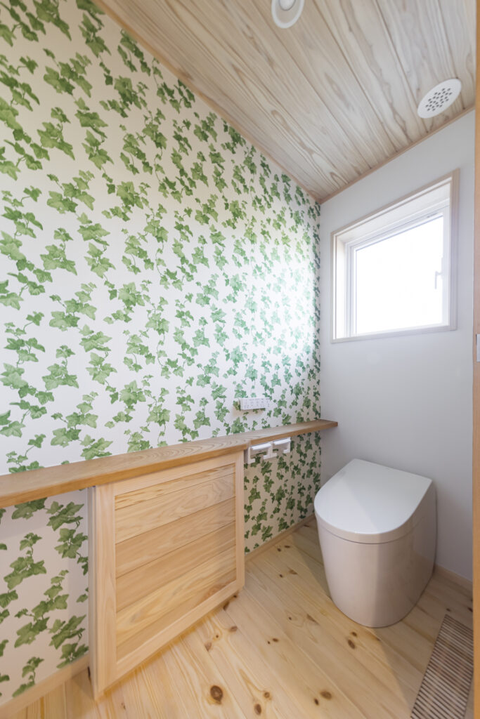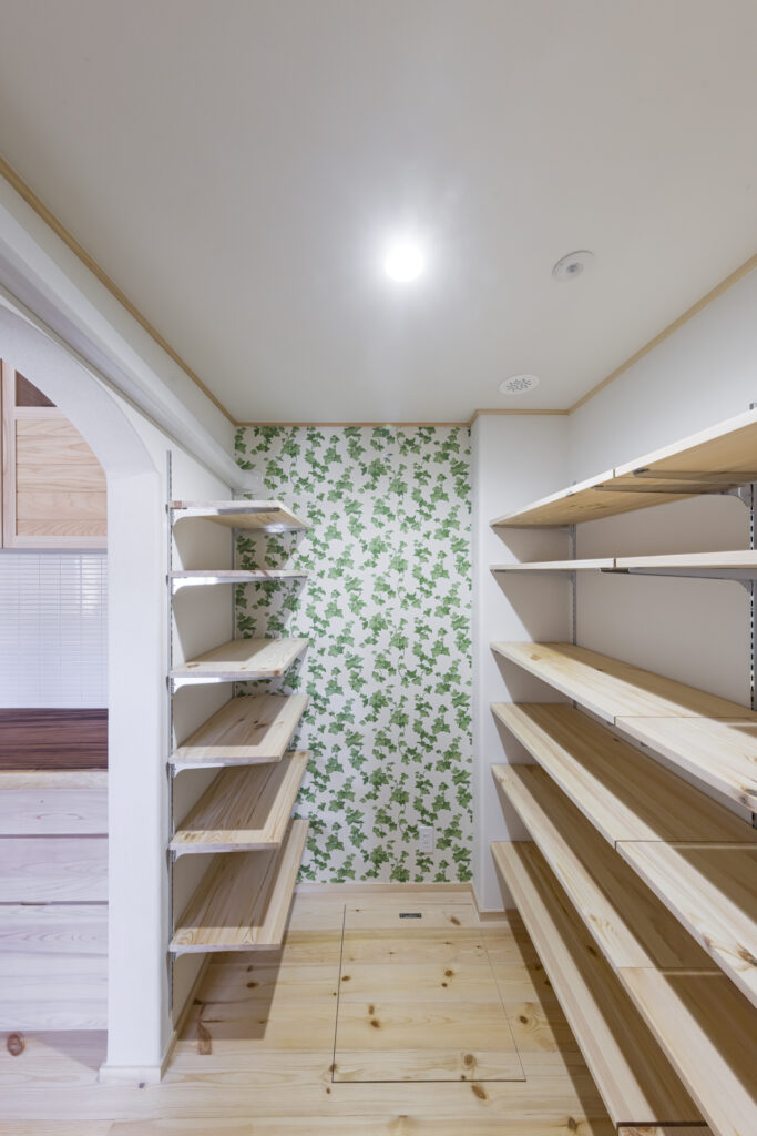 パントリーとトイレの壁には輸入壁紙を使いアクセントに。