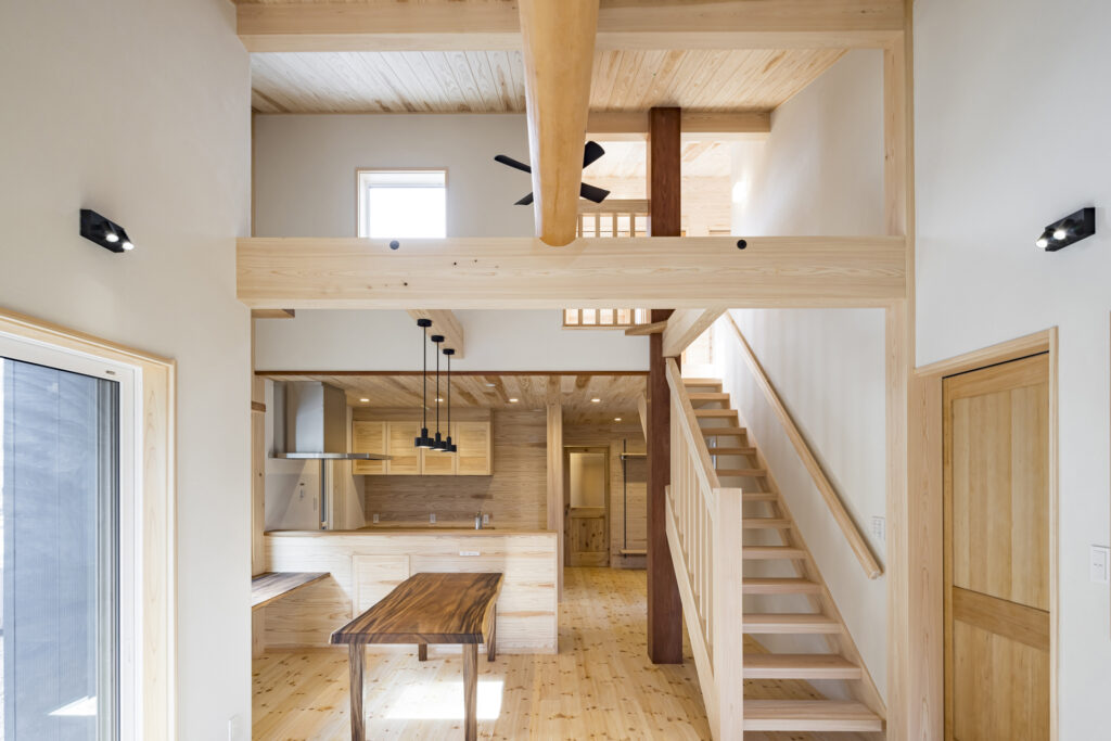 一直線のLDKにストレートな階段。吹き抜けの梁は空間を支える大事な構造材。今回はネコちゃんのキャットウォークも兼ねて。