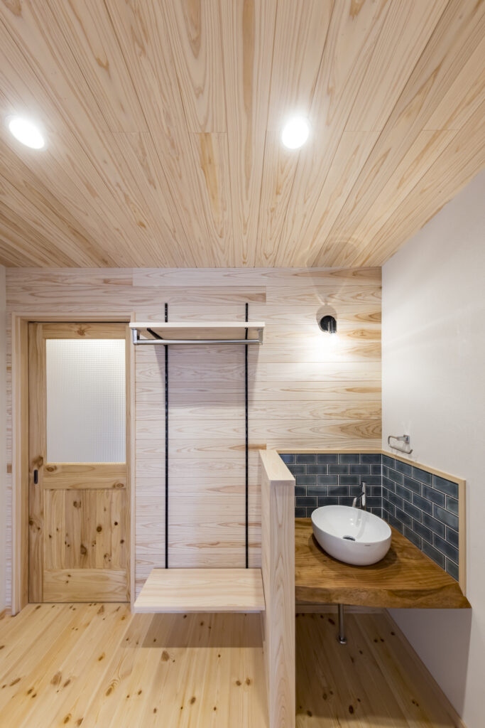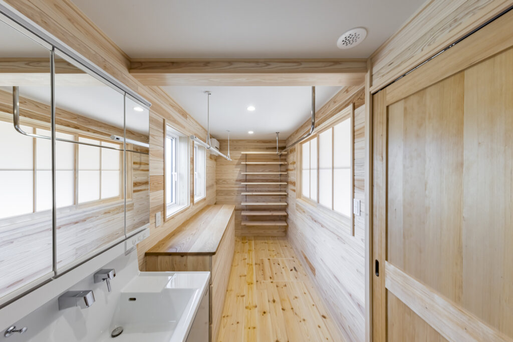 ランドリースペースと脱衣場。必要に応じてロールスクリーンで間仕切り可能な空間。大きく取った明り取りの飾り窓で一日中明るい。北から南まで風が抜けるように引き違いで制作。外干しが難しい立地などでも嬉しいスペース。