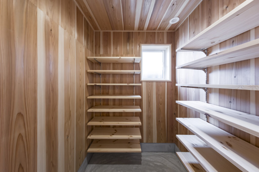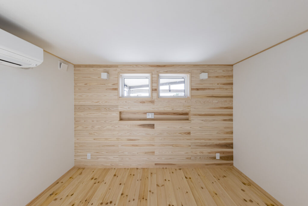 1階寝室は天井高さを2.2mまでとし、落ち着きのある空間に。一面のみ源平杉でアクセントをつけた。壁面にはニッチを設けた。