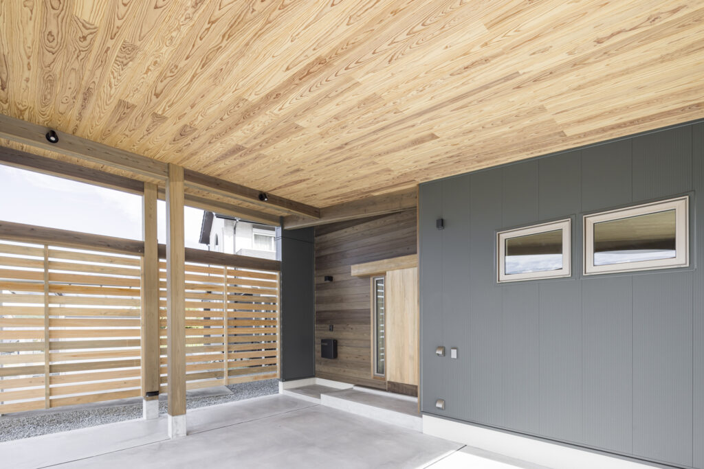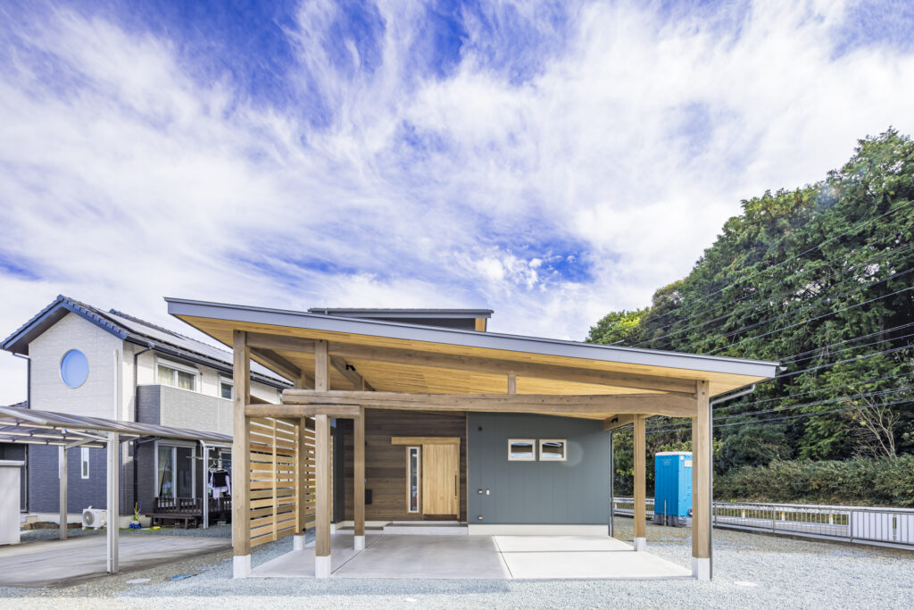 ご希望の車寄せ2台分は太い太鼓梁を重ね屋根は建物と同じ断熱パネルで施工しました。室内は東西に長い敷地を活かした間取りに。一直線のLDKにストレートなオープン階段はカリンの7寸通し柱で空間を持たせながらアクセントを付けます。