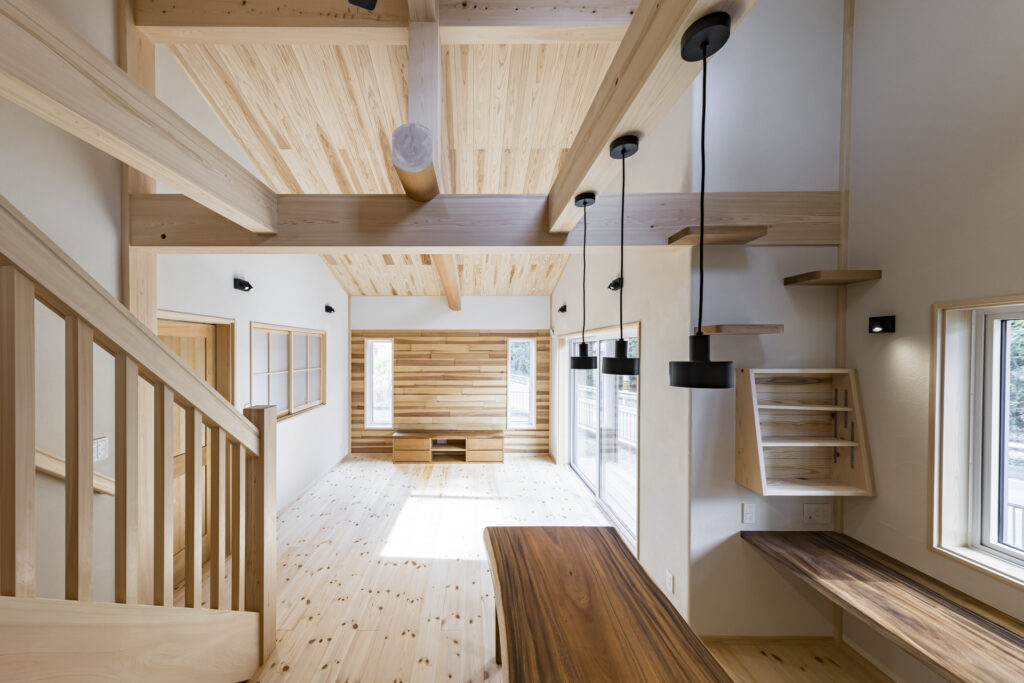 板張り部分は全て源平杉にして一部にラオス松を使用。白い塗り壁とコントラストを付けました。吹き抜け空間には構造材の梁が1、2階をつなげるキャットウォークになります。